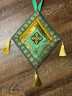 Green brocade palitsa with gold/green trim. Green ribbon/strap that goes over the shoulder.
