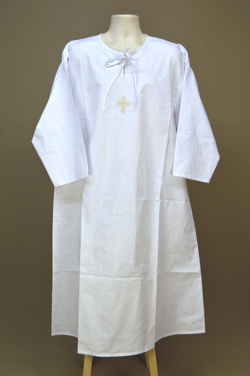 Older child-sized baptismal robe/gown. Lightweight breathable fabric - 100% Cotton. Cross is sewn on the front side.