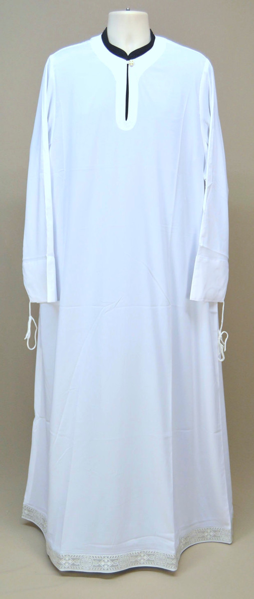 A priest sticharion/podriznik made from white silk, with silver galloon. (pattern may vary from photo)