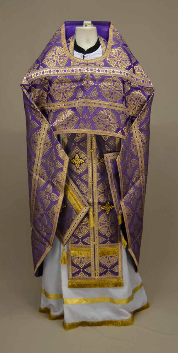 A brocade, purple set of Russian style priest's vestments with gold galloon trim. Brocade pattern may vary slightly from photos.