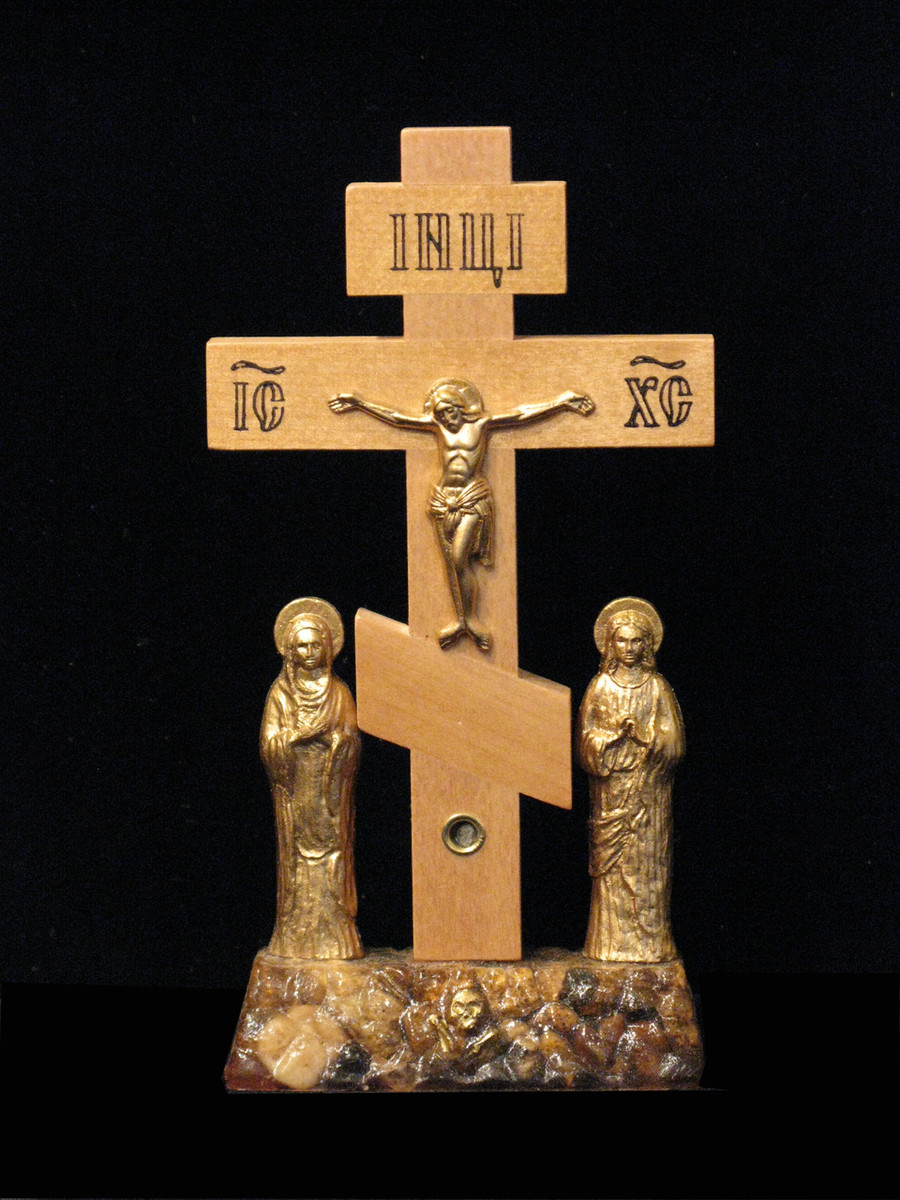 Small Golgotha Cross. The little circular reliquary under the slanted crossbeam contains a particle of earth (soil or rock) from Jerusalem.
