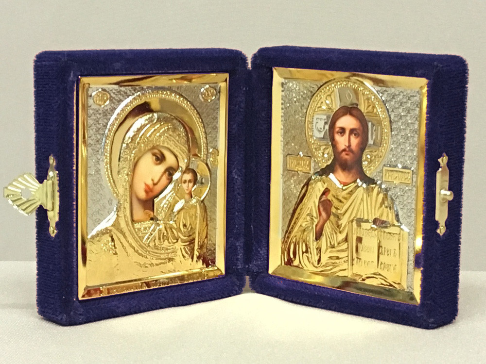 Kazan Icon and Saviour with riza in red velvet diptych. Dimensions: 5.5" W x 3.25" T.