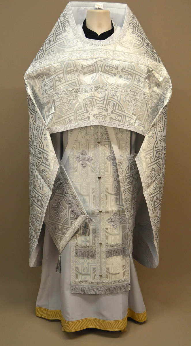 A brocade, white set of Russian style priest's vestments with silver/white galloon trim. Matching chalice covers included